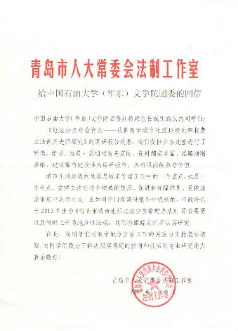 文学院暑期张文坛等完成的调研成果“特色经济产业之路在新型城镇建设中的角色探索——以山东省济南市平阴县玫瑰经济为例”获二等奖,指导教师为于露;强雪锋等完成的调研成果“垃圾分类难在何处——从青岛市城市生活垃圾处理收费立法视角进行研究”获三等奖,指导教师分别为巩亮、董岩,该项目获得青岛市人大常委会法制工作室的高度认可。