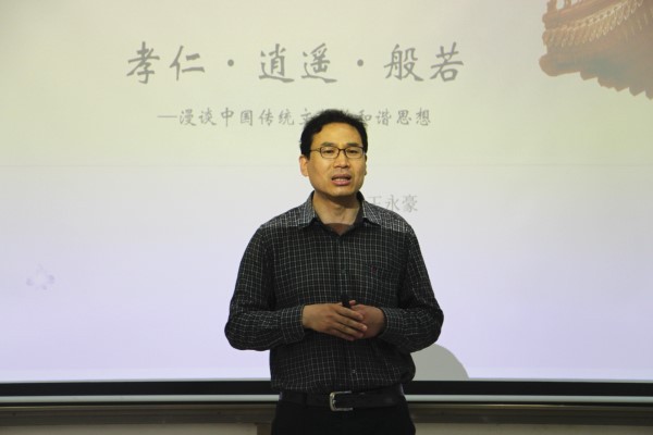 6月2日,由文学院主办的博雅大讲堂第八期开讲,本次讲座主题为“孝仁•逍遥•般若——漫谈中国传统文化的和谐思想”,讲座由文学博士、我院副教授王永豪主讲,我院党委书记张永宁、副教授刘乃亮出席本次活动,全校对传统文化感兴趣的学生参加。