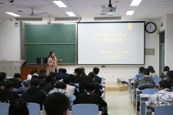 1110号,由文学院党委主办,俄语语言文学系党支部承办的第五届国际文化大观园系列讲座之“美国之旅那些事”于南教楼314举行。本次讲座由文学院英语系讲师、文学院团委副书记付晓主讲,校内众多对美国文化有浓厚兴趣的学生参加。