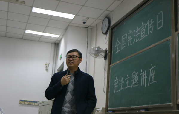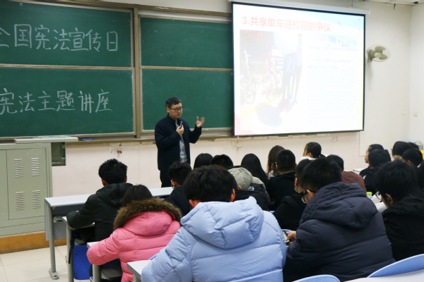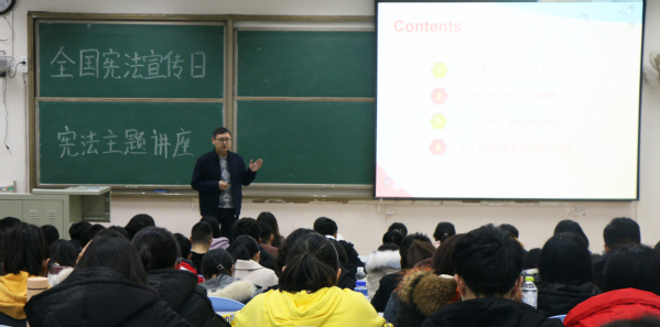 12月4日,由文学院团委主办的宪法主题讲座于讲堂群西环101教室举行。本次讲座由文学院法学系副主任、青岛仲裁委仲裁员董岩担任主讲人,文学院2017级2018级300名学生参加本次活动。