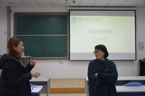 谌老师提到,从1982年到现在,我国从封闭式的状态转变成现在开放多元的发展状态,宪法为顺应这种社会变化,不断地调整其中的部分内容,展现出它开放包容的一面。谌老师以计划生育政策的为例,告诉同学们宪法与我们的生活密切相关,宪法的实施也可以帮助我们更好地生活。谌老师结合孙志刚案,讲道宪法最核心的内容是“人权”和“宪权”,而其中最主要的是“人权”,国家的存在也是为了人的发展,国家进步的同时,人民也在进步。在互动环节中,法学专业的同学就“宪法如何保护公民权利”等问题与老师展开讨论,谌老师提出,宪法确实不像刑法那样有明确的条文指示,但是,宪法更像指路明灯一样,在依法治国的发展进程中起到重要的引领作用。宪法是母法,而且它已经深入到了我们的生活中,我们应该尊崇宪法、学习宪法、遵守宪法、维护宪法、运用宪法。讲座最后,谌老师结合自己的经历,针对同学们的发展规划提出了一些建议,她告诉同学们时代的发展变化要求我们要提高自己的专业技能、文字处理能力以及语言表达能力。这也是我们将来步入工作岗位的必备技能。