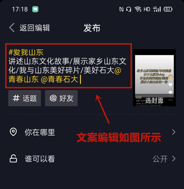 抖音参与:每两天带话题#爱我山东#(井号后生成话题,话题后空一格)并@青春山东 @青春石大 (@的名称后空一格),内容为讲述山东文化故事、展示家乡山东文化、我与山东美好碎片、讲述山东美景佳肴(任选其一即可),形式不限,可以是文章、图片也可以是视频或Vlog形式。