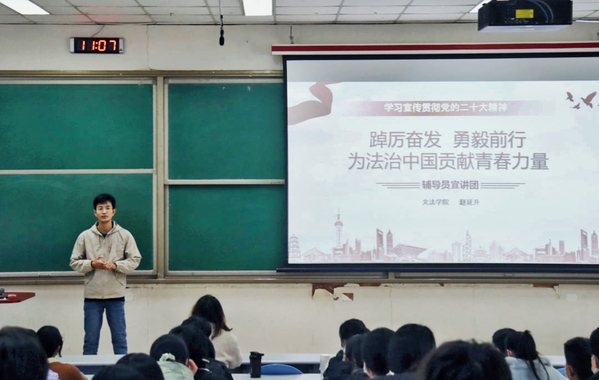 为加强学生思想政治教育和价值引领,激励广大学生从党的二十大精神中汲取前行的智慧和力量,12月7日,太阳成集团tyc151cc辅导员在西环201以“踔厉奋发,勇毅前行,为法治中国贡献青春力量”为题进行党的二十大精神宣讲,辅导员赵延升以及2022级主要班团干部参与。