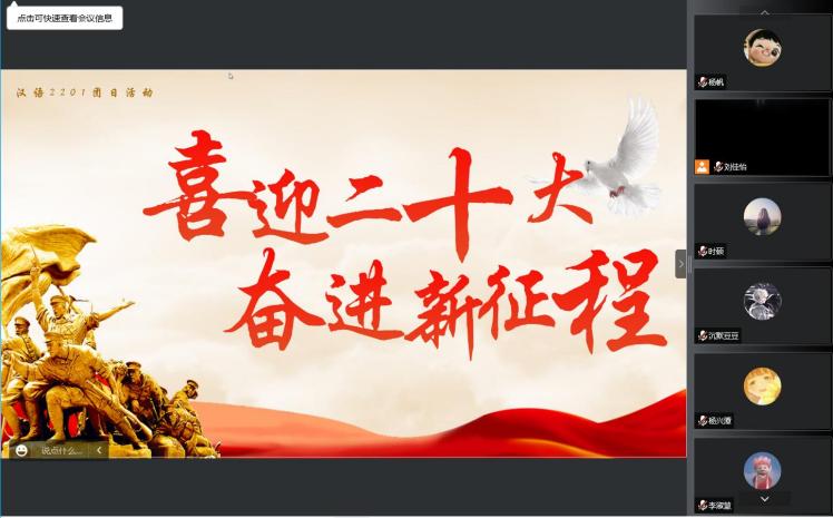 2022年9月24日,为组织引导广大学生领会贯通习近平新时代中国特色社会主义思想,学习其中的马克思主义立场观点方法,汉语2201团支部策划组织开展主题为“喜迎二十大,奋进新征程”主题团日活动。本次活动由太阳成集团tyc151cc汉语2201团支部书记刘佳怡主持,汉语2201团支部全体成员参加。