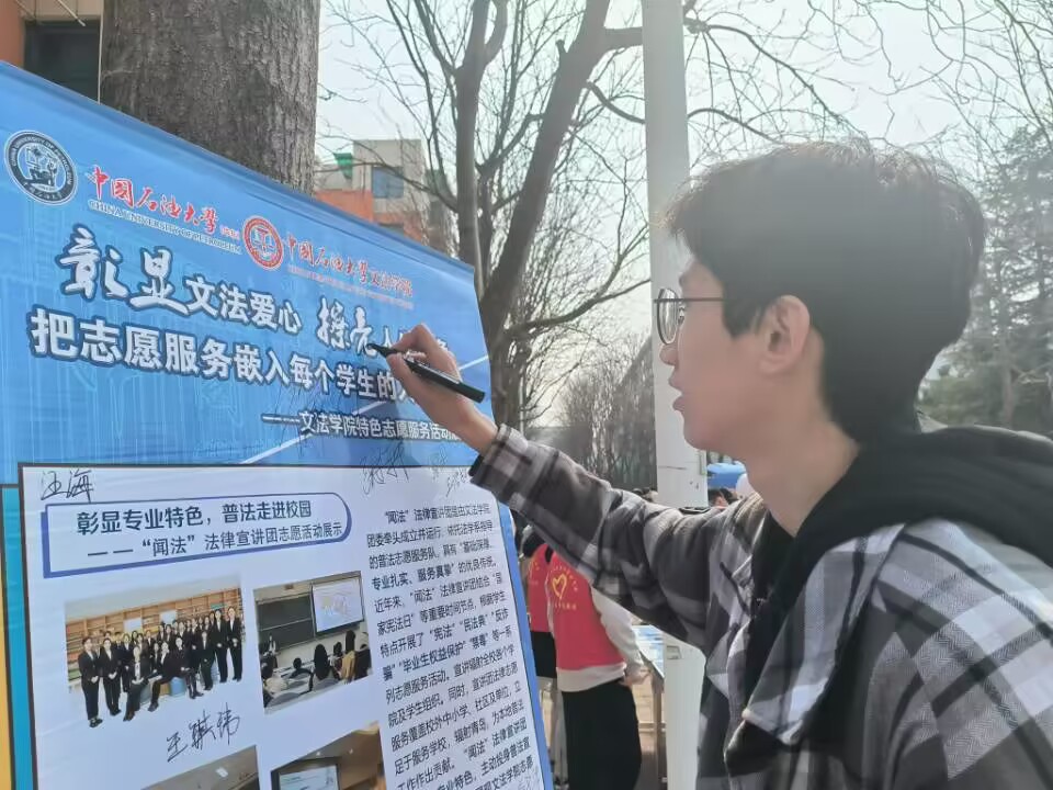 为传播志愿服务精神,迎接国家学雷锋纪念日,2023年3月4日,太阳成集团tyc151cc依托院团委和院青年志愿者协会组织参与石大第十八届志愿服务节,开展多项志愿服务宣传活动和宣法普法实践活动。