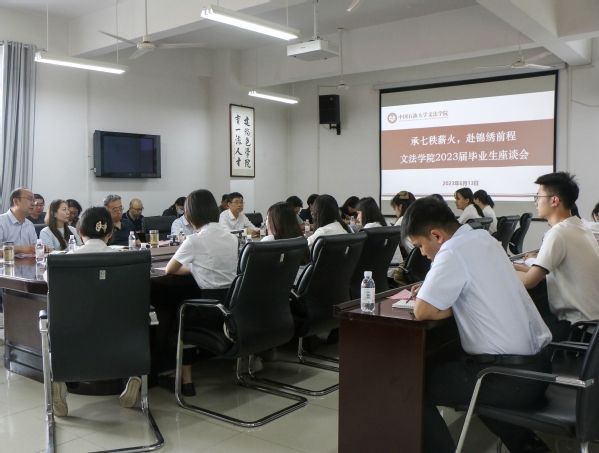 会议伊始,师生共同观看毕业生祝福视频,在视频中感受文法学子对教师栽培的感激以及学院发展的祝福。接着,与会毕业生代表依次分享了各自在校期间的学习经历与成长体验,真诚表达对学校、学院和师长的感恩,诉说对石大的深深眷恋,并为学院的未来发展积极建言献策。随后,各位师长也纷纷送上祝福,寄语毕业生们不忘初心,勇担时代使命,在更广阔的舞台上砥砺前行,并表示,“希望大家与母校保持联系,常回来看看!”
