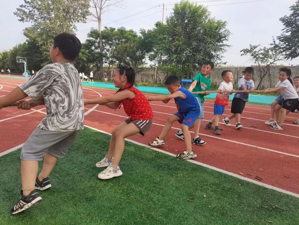 首先,开展的项目是短跑比赛,在“预备:跑!”一声令下,孩子们像离弦的箭冲向终点,你追我赶,勇争第一;在休息间隙,六年级的孩子开始了足球比赛,随着主裁判的一声哨响,两队开始了激烈地拼抢,在两队的共同努力下,两队不相上下,都取得了较为优异的成绩;接着,开展的项目是接力折返跑,孩子们自由组队,根据自己的跑步速度自行分配不同节点的人选,接力跑往往需要考量小队伍的团结和配合能力,四个队伍的接力跑速度相差不大,每个小团队都在为共同的胜利而团结互助、一起努力;随后,开展的是“一二三木头人”和“趣味跳绳”活动,一二三年级与四五六年级分别开展。“一二三,不许动!”听着一声声口令,孩子们时而向前冲,时而立在原地,欢声笑语常常萦绕在耳畔。哨声一响,紧张的跳绳比赛拉开了帷幕,每位参赛的学生都使出浑身解数,超越自我,跳出了自己的好成绩。最后,开展的是“拔河”比赛,支教队成员将学生根据身高体重划分为两个小组,在一声声口号中,每个孩子都紧紧地拉住绳子,身子往后倒,脚站成弓步,听到“比赛结束”的口令,孩子们松开绳子,坐在地上,交谈着比赛的所感。