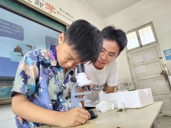 “和孩子们一起探索科学世界的奥妙”支教队成员于函开展了科学小实验课程,主要包括紫甘蓝变色实验、用显微镜观察洋葱表皮细胞实验。在紫甘蓝变色实验中,通过孩子们亲自操作,将苏打水、白醋分别倒入紫甘蓝汁中,观察现象,让孩子们生动地了解紫甘蓝汁中含有大量花青素,酸性的白醋可以它变红,碱性物质可以让它变蓝。在观察洋葱表皮细胞的过程中,于函带领孩子们先了解了显微镜各个部分的名称,然后让孩子们在正确的操作规则下进行实操。于函感慨:“望着孩子们上课时一双双求知若渴的眼神,我希望能通过简单的科学小实验,让孩子们对科学产生兴趣!”