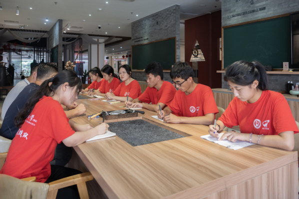 来到孔子研究院主楼一层,实践队员们就踏入了优秀传统文化体验区。据了解,2013年11月26日,习近平总书记视察孔子研究院时发表重要讲话,指出:“在曲阜建设孔子学院总部体验基地,使国外学生看了‘三孔’,再到孔子研究院进行深加工、再提升,体验中华文化,是可行的。”实践队员了解到,今天看到的孔子学院总部体验基地,就是贯彻落实习近平总书记指示精神的生动实践,致力于用孔子的思想研究孔子。