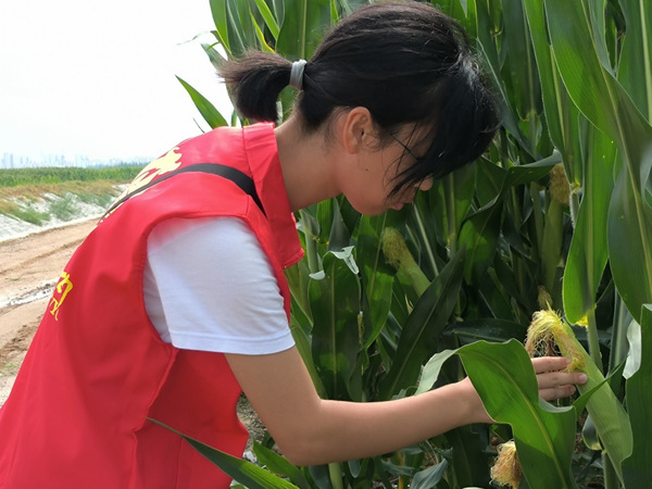 实践队员实地进入“鲁望”试验田查看玉米及其他作物长势 李娜摄