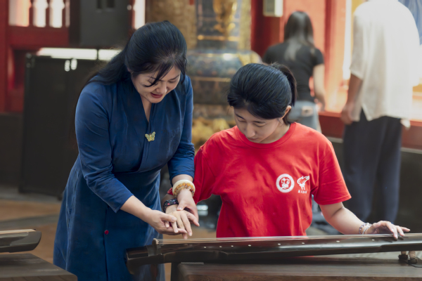 实践队调研尼山圣境之日,正逢“五道雅集”亮相尼山圣境大学堂,以书、花、琴、香、茶“五道”为核心,邀请各行专家教师为游客现场授课。“拜仲尼,忆子期,琴指古道,但使遗韵尽作古。弹阳关,抹流水,弦思知音,愿留余音永绕梁。”循着清雅婉转的琴声,实践队员来到了琴道学习现场,围坐在北京古琴文化研究会理事、国家图书馆古琴项目负责人兼导师邱丽晔的身旁学习了解古琴知识。在这里,实践队员们弹古琴、听古音,感受“非遗”的文化魅力。