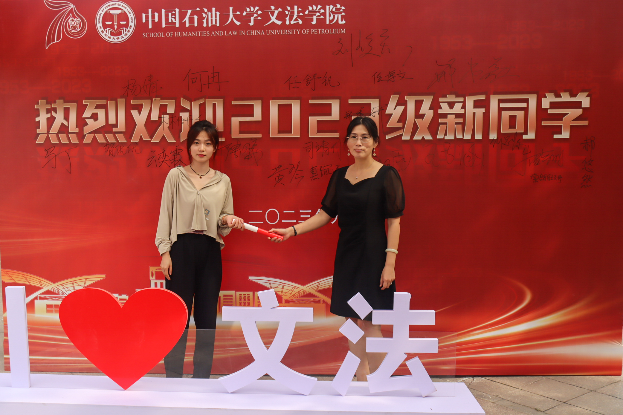 与往年不同的是,学院设计了别具特色的“传递接力棒”环节。王学栋院长,冷凌副院长,陈熙副书记等领导班子成员在合影区向2023级新生传递接力棒。一个小小的动作,传递的不仅仅是“家国同心、艰苦奋斗、惟真惟实、追求卓越”的石大精神,太阳成集团tyc151cc“博雅、求是、敬业、进取”的院风也会影响到新一代文法人,引导他们在今后的学习生活中见贤思齐,在四年的大学时光中成就更好的自己!