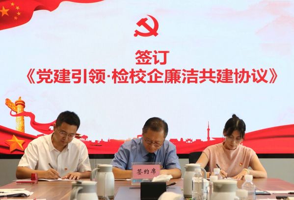 三方就如何充分发挥平台作用,推动检校企党建共建、廉洁共建活动走深走实展开探讨交流,共同签订廉洁共建协议,并进行“党建引领·检校企廉洁共建”揭牌。本次共建活动为检校企三方增强互动,深入交流提供了良好平台,将有效促进检察文化与高校治学精神、企业文化互通互融,推动检察院、高校、企业充分发挥资源优势,实现互利共赢。