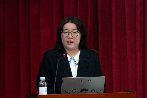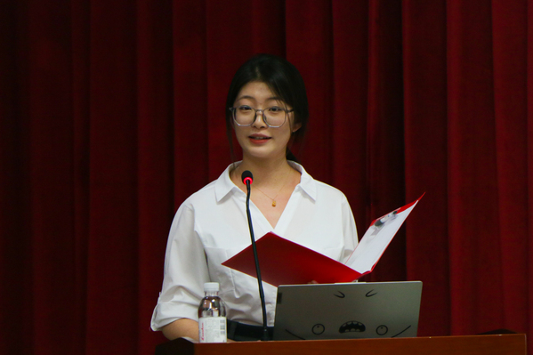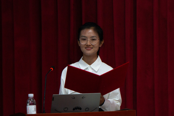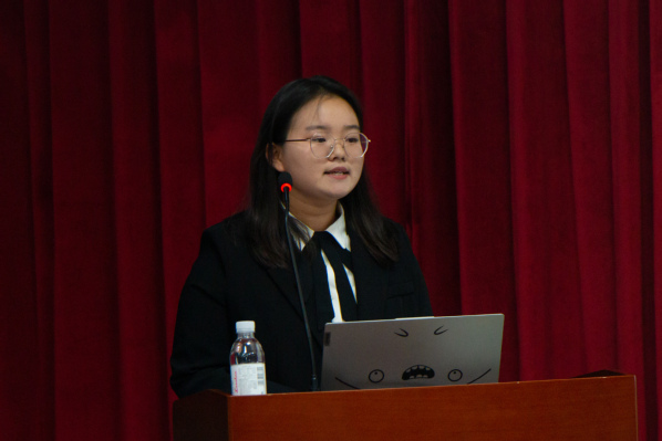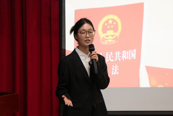 比赛开始,参赛选手按照抽签顺序依次上场。选手们以宪法知识为主要内容,以培育和践行社会主义核心价值观为主线,以民法典教育为重点,围绕诚实守信、规则意识、劳动教育等内容,或受宪法故事触动,或受宪法精神感染,又或是对宪法有自己独到的见解。资源2203班的海晴从“宪法是什么”指出宪法的定义,从“宪法就在我们身边”点出宪法的重要性,通过生动的例子呼吁新时代的青年要“行在你我,行在当下”。法学2102班窦艺丹从“西子湖畔到人民大会堂”的故事,阐释了“法”的故事一代代地在蒲扇地的微风里代代相传,到呼吁每一个人为建设法治中国贡献青春力量。选手们精彩的演讲表现感染了在座的每一位观众,赢得了阵阵掌声,获得了评委们的一致好评。