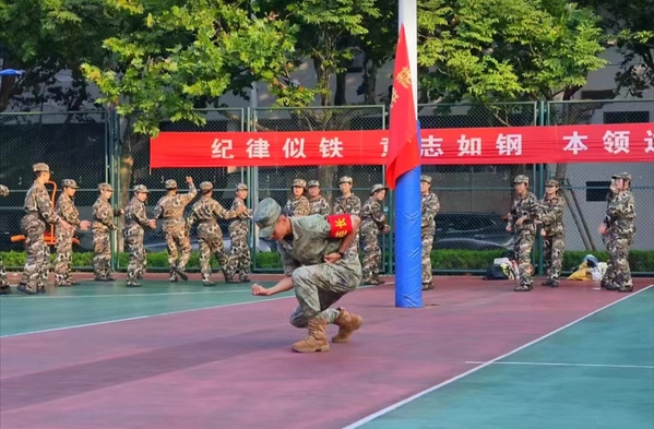 齐步、跑步、正步……整齐、坚定,在教官亲自演示下,提腿、摆手、跨步、挺胸,每一个动作,每一个细节,文法学子牢记在心,身姿挺拔,精益求精。一遍遍的演示、一次次练习、一声声呐喊,文法学子的努力与汗水没有白费,分裂式整齐划一,出腿有力,回踏有声。文法学子在训练场挥洒汗水,融助芳华。当然队列班的训练也没有拉下,秉承着精益求精的精神与原则,队列班成员拿出全部的精力与力气,齐步我们文法七连要走的最齐,正步我们文法七连要踏的最响,文法学子用他们的拼劲和闯劲书写着青春最美华章。值得一提的是,在教官的教导下,文法举旗手训练成果斐然,文法七连的连旗虎虎生威,展现了精钢七连的昂扬的精神面貌。