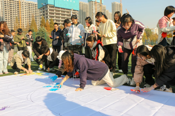 户外活动分为“共绘青春树”“挑战”“一圈到底”“口口相传”以及“百人共绘UPC”五个项目进行,由机自2203团支书王晗宇主持。在“共绘青春树”活动中,支部成员带好一次性手套后蘸取颜料,以手作笔在画布上印下手掌的印记,并在画布上签名、合影留念。全体支部成员积极参与“挑战”、“一圈到底”等户外活动,各团支书积极组织、及时协调。最后,各团支部所有支部成员手摇国旗与团旗在五人制足球场摆成“UPC”字样,以庆祝本次团日活动圆满举行。