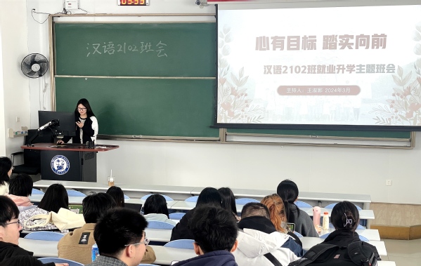 在进入大三下学期后,学生们面临着就业或升学等多项选择。为帮助同学们了解各种去向的具体情况,认识到自己未来将面临的抉择,制定出适合自己的人生规划,汉语2102班于3月28日上午十点在西环302召开以“心有目标,踏实向前”为主题的就业升学班会。本次班会由班主任郝婷婷老师莅临指导,班长王淑娜主持,汉语2102班全体学生参与。