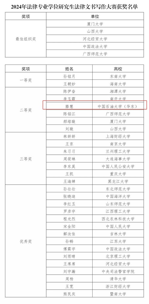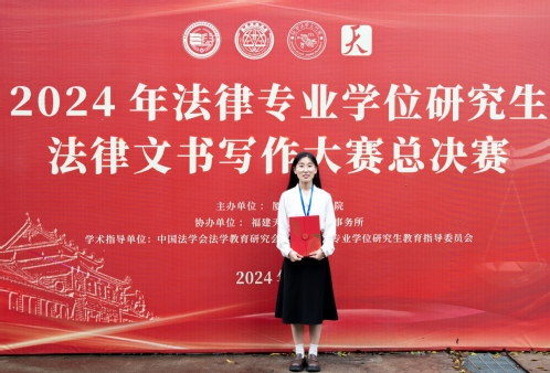 2024年6月1日,2024年全国法律专业学位研究生法律文书写作大赛总决赛在厦门大学举行。本次大赛由厦门大学法学院主办,福建天衡联合律师事务所协办,全国法律专业学位研究生教育指导委员会、中国法学会法学教育研究会作为学术指导单位开展指导,共有211所院校参赛。初赛以线上投稿方式进行,共收到3084份作品,80名选手入围复赛。复赛采用线上双机位方式进行,经过复赛的激烈角逐,30名选手入围总决赛。总决赛需要选手在三小时内完成一份法律文书写作,最终我院2023级法律(法学)硕士研究生滕慧荣获2024年全国法律专业学位研究生法律文书写作大赛二等奖。