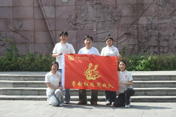 随后,实践队成员沿着台阶拾级而上,登上了当年红军三渡赤水河的茅台渡口的朱砂堡顶,眼前矗立着的是高大雄伟的红军四渡赤水纪念塔。塔身由四根巨大的浪柱形依次错位重叠构成,浪柱形上部悬嵌着不锈钢球,恰似腾空的浪花,塔座为木船造型,寓意着中国人民的革命事业乘风破浪前进。纪念塔西侧建有一碑墙,黑色大理石上镌刻着《红军四渡赤水简介》和《建红军四渡赤水纪念塔记》,成员们从字里行间感受到了中国红军不畏艰险、不怕牺牲、勇往无前的革命精神。
