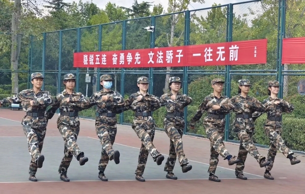 9月8日,正是军训第8天,2024级文法学子们重整军装,昂首挺胸,直面骄阳。