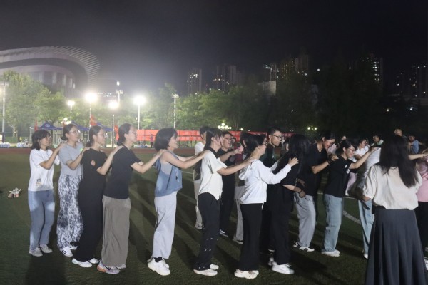 晚七点,文法师生准时相会大操场,欢声笑语连绵不绝,他们围坐成一个个圆,等待着心理团体辅导活动的正式开始。随着一声声“左左右右,前前后后,go go go!”的口号,“兔子舞”拉开了心理团辅活动的序幕。跟随动感热情的音乐,新生们蹦蹦跳跳,你牵着我,我牵着你,绕成一个大大的圆圈,现场气氛瞬间升温,同学间、师生间的距离,被相连的双手取代。