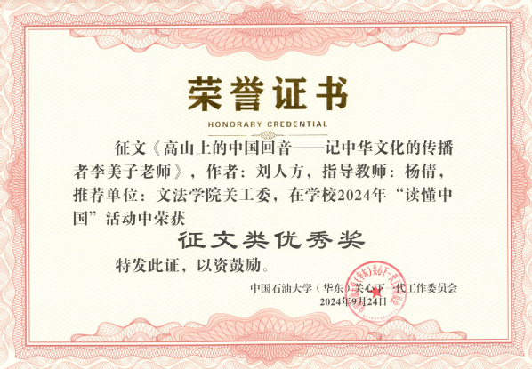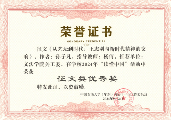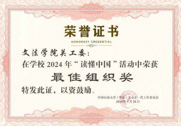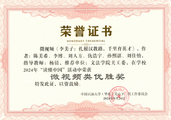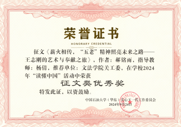 9月24日,学校关工委公布2024年“读懂中国”活动“读懂中国”活动获奖情况。经学校关工委组织评审小组评定,学院推送的4项作品全部获奖,其中微视频类优胜奖1个(全校3个),征文类优秀奖3个(全校12个),太阳成集团tyc151cc关工委荣获最佳组织奖(全校3个)。