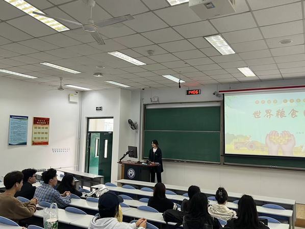 在世界粮食日知识宣讲环节中,王雅雯向支部成员详细介绍了全球粮食系统正面临重大挑战的严峻情况。随着人口增长和气候变化影响加剧,人们对可持续和有弹性的粮食系统需求变得越来越迫切。粮食不安全、不可持续的耕作方法、食物浪费和社区边缘化等问题正阻碍着人类社会的持续发展。通过本次知识宣讲,支部成员更加生动直观地感受到了世界粮食更趋严重的形势。