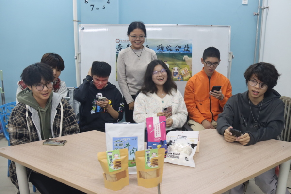 抽奖活动、满减活动、歌舞表演、搞怪剧本……大学生直播团队们逐渐摆脱紧张和青涩,在镜头前侃侃而谈,熟练讲解产品,“科左后旗奶肉香,魅力无敌震八方,直播开启快入场,美味狂欢不重样!”口号动人,表演活跃,直播间反响非常热烈,销量喜人。