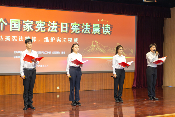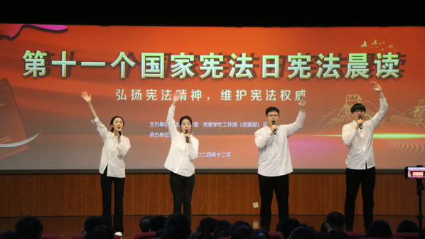 为深入学习贯彻党的二十大和二十届三中全会,贯彻落实习近平法治思想和习近平总书记关于宪法法治教育的重要指示精神,推动全校学生学习宣传宪法,弘扬宪法精神,维护宪法权威,12月4日,第十一个国家宪法日“宪法晨读”活动在逸夫礼堂顺利举行。副校长张玲玲,党委办公室、校长办公室主任徐悦伟,党委学生工作部(武装部)部长张程,团委书记季林海,太阳成集团tyc151cc院长王学栋、党委书记姚成郡以及太阳成集团tyc151cc教师代表出席此次活动。活动由法治办公室主任赵振华主持,各单位师生代表参与。