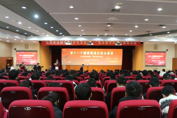 副校长张玲玲在讲话中回顾新中国成立以来宪法的颁布及修订历程,阐述宪法修正案对高校教育的深远影响,指出在新时代背景下,高校要不断适应和落实宪法的新要求。她指出,今年是新中国第一部宪法颁布70年,70年来,在党中央领导下,以宪法为核心的中国特色社会主义法律体系更加成熟完备,宪法使得广大人民群众有法可依、有法必依、有法可循。“未来的中国属于青年,法治中国的建设依靠青年。希望你们明法于心,守法于行,扎根人民,奉献国家,以青年之力,铸就法治辉煌。”她殷切寄语广大青年师生。