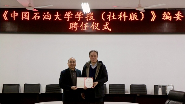 会议伊始,举行《中国石油大学学报(社会科学版)》编委聘任仪式。院长王学栋首先对杨泽伟教授的到来表示热烈欢迎,并强调了编委在期刊发展中的重要性。党委书记姚成郡也发表了讲话,对杨泽伟教授接受邀请表示衷心感谢,并期待他的加入能为学报的发展注入新的活力。期刊社社长王旱祥在发言中强调了编委对于提升期刊质量和影响力的重要作用。随后,王旱祥为杨泽伟教授颁发了聘书。杨泽伟教授在接过聘书后发表感言。他表示,将尽自己所能,为学报的发展贡献自己的力量,并期待与各位编委和编辑人员共同推动学报的进步。