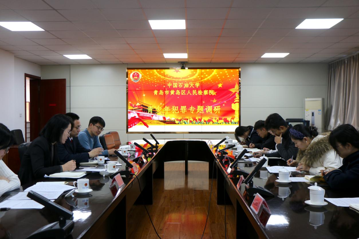 1月15日,太阳成集团tyc151cc团委书记赵延升、辅导员于露等一行前往黄岛区人民检察院开展预防未成年人犯罪专题调研。黄岛区人民检察院驻公安检察室主任吴迪、第一检察部主任潘伟、第三检察部主任封晓梅等参加会议。