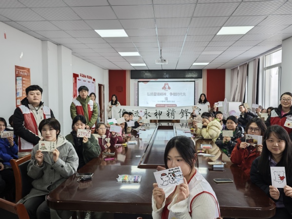 通过开展雷锋精神知识问答、雷锋故事分享会等活动,小朋友们不仅加深了对雷锋生平事迹的了解,还深化了对雷锋精神核心价值的认识,深切感受他那颗始终为人民服务的赤子之心。支部成员与小朋友们一起将自己对雷锋同志的景仰之情写进了一方纸笺中,并用稚嫩的语言将雷锋精神传唱,签下一份份珍贵的“心灵契约”。现场火热的气氛将活动推向高潮,团支部成员与小朋友共同欣赏我院美术系王成宝讲师特为此次活动赠送的墨宝——雷锋精神永流传,并在横幅上以青春的名义宣誓,将雷锋精神融入日常学习与生活,积极参与志愿服务活动,用实际行动践行无私奉献、乐于助人的理念。活动结束后,支部成员即刻践行誓言,主动将会议室桌椅恢复原貌,清扫地上垃圾。