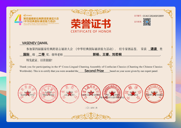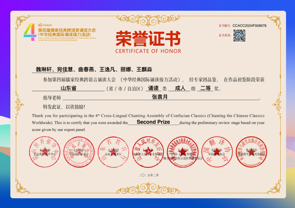 近日,第四届儒家经典跨语言诵读大会(中华经典国际诵读接力活动)圆满闭幕。大赛由尼山世界儒学中心,中国孔子基金会,山东省教育厅,山东省对外友好协会,中国—上海合作组织地方经贸合作示范区管理委员会联合主办,旨在深入贯彻落实习近平文化思想,创新中华文化传播路径,增强中华文化感召力,向世界讲好中国故事,促进世界文明交流互鉴。