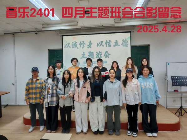 为深入贯彻落实社会主义核心价值观,弘扬中华民族传统美德,引导大学生树立正确的道德观念,4 月 28 日,音乐 2401 班于看台 129 教室举办 “以诚修身 以信立德” 主题班会。本次班会由班长苏筱淇主持,通过“修学诚信之韵”“研习诚信典章”“模拟诚信之境”“共签诚信之约” 四个环节,将音乐专业特色与诚信教育深度融合。