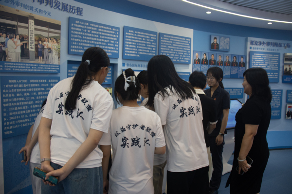 在青岛国际商事法庭,法官首先向队员们讲解了旗帜领航区、法治文明区、开放包容区、实践创新区、对外交流合作区五个板块,不仅涵盖了青岛的对外开放史和青岛市中级人民法院的涉外审判史,还生动展现了青岛国际商事法庭“法安天下商”的核心理念与特色品牌。