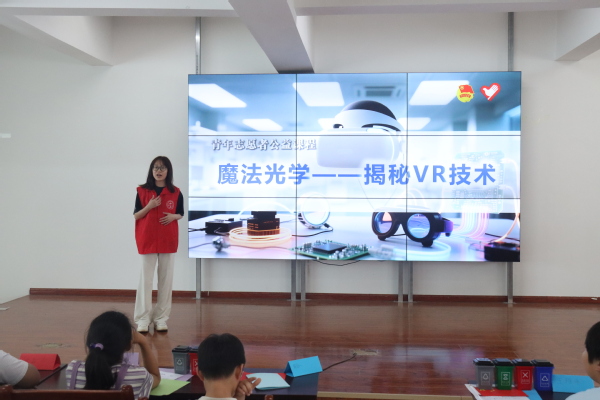 VR体验课伊始,志愿者从虚拟现实技术的基本原理切入,用通俗语言解释VR的核心概念,并介绍其在医疗、教育、军事等领域的应用。随后在志愿者的协助下,孩子们按照步骤亲手制作了VR眼镜。在体验环节中,志愿者播放《最美中国》VR 版、海底世界、恐龙主题等视频内容,孩子们戴上亲手制作的眼镜,仿佛置身于壮丽山河、深邃海洋与史前森林。观看过程中,现场不时传出“好像真的在过山车上”“恐龙就在我眼前”的惊叹声。志愿者向孩子们强调VR 正在彻底改变人们认识世界的方式,并鼓励大家好好学习,未来创造更多世界领先的科学技术,造福人类,为祖国做贡献。