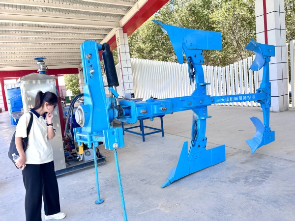在天业节水工作人员的带领下,实践队成员们参观了公司的产品展示区,近距离观摩了先进的节水灌溉设备、智能喷药机械、高效农用犁具等现代化农业装备。公司技术人员详细介绍了压力补偿滴灌带、迷宫式滴灌带、内镶式滴灌带等核心产品的工作原理及应用场景,并现场演示了智能水肥一体化系统的运行方式。
