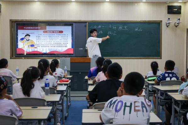 为了丰富课堂内容,提高学生对普通话知识的接受程度,团队成员别出心裁的设计了一系列妙趣横生的游戏环节,孩子们此起彼伏的欢笑声将课堂气氛推至高潮。“干一行行一行,一行行行行行。”一句复杂的绕口令使在场众多学生陷入疑惑,实践队成员辛书瀚微笑着耐心向他们拆解这句话的结构,并借此机会科普了有关多音字的知识。随后,他又向大家展示出一些多音字绕口令,这些绕口令由短到长,由简单到复杂,学生们独立摸索着发音规律,逐渐加深了对多音字的了解。“我最开始学普通话的时候总因为多音字而云里雾里,听完这节课,我的好多疑问都解开啦!”四年级的呼博其同学兴奋地说道。