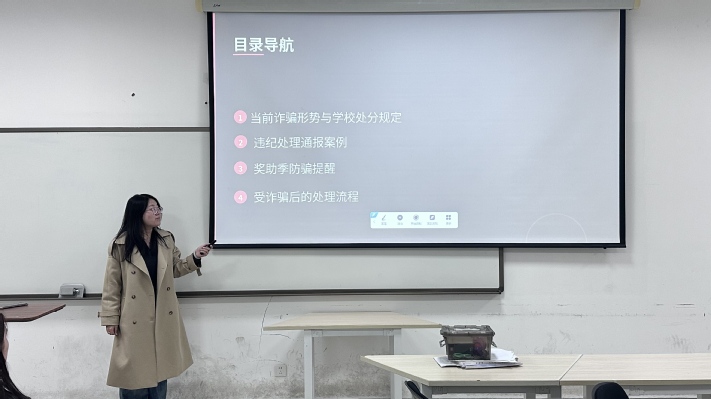 班会围绕当前高校诈骗形势、学校纪律处分规定、真实案例警示、奖助季防骗要点及受骗后的应急处置流程等内容展开。会议首先介绍了大学生群体中高发的几种诈骗类型,包括因猎奇、猎艳、侥幸心理引发的网络诈骗等,提醒同学们务必保持高度警惕。在纪律教育环节,班会详细解读了学校对参与或协助诈骗行为的学生的处分规定。此外,班会重点讲解了冒充熟人、老师、银行等常见诈骗手段,并提供了实用的防范建议,如通过官方渠道核实信息、不轻信陌生链接、不向不明账户转账等。