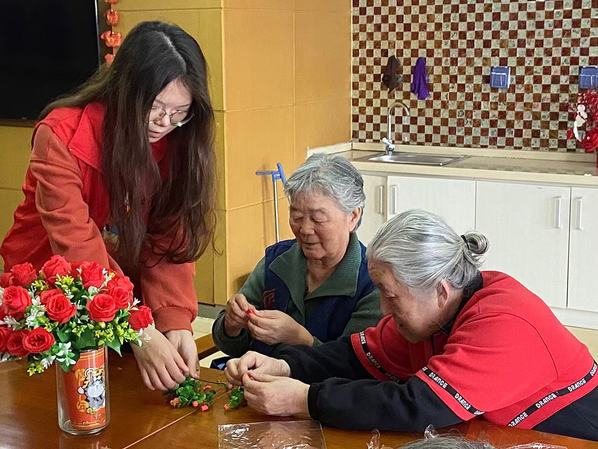 活动伊始,团支部成员与老人结对,共同完成茱萸的手工制作。学生耐心协助老人查看步骤、调整装饰,现场满是欢声笑语,一个个精致的茱萸不仅承载着传统节日的寓意,更拉近了青年与老人的距离。