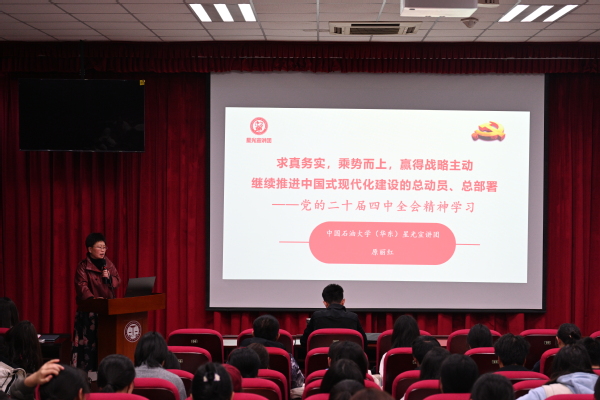 原丽红从党的战略规划、全会的背景与历史地位、核心战略部署及其要求与保障等方面进行系统阐述,详细解读党的二十届四中全会精神。她表示中国共产党是善于做战略规划的党,带领中国人民一步步地共同绘制着民族复兴的壮阔蓝图。她详细比较了十四五和十五五规划的背景,指出两个五年规划侧重点的不同之处,并强调“十五五”时期是基本实现社会主义现代化的关键时期,在基本实现社会主义现代化进程中具有承前启后的重要地位。她从“十五五”时期的重要地位、宏观要求等多个方面解读《中国共产党第二十届中央委员会第四次全体会议公报》。