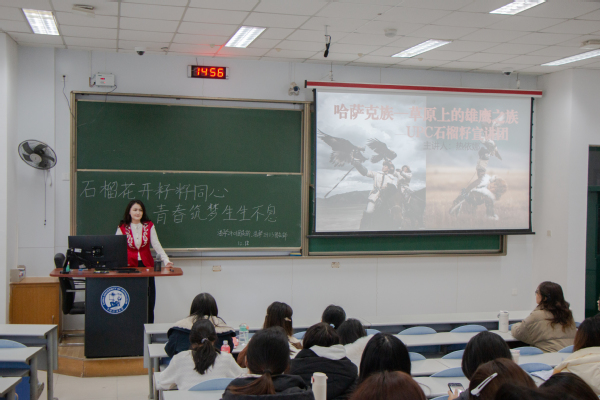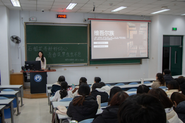 宣讲环节中,穆合斯娜以“维吾尔族的服饰与建筑文化”为主题,通过图文并茂的展示,讲述了维吾尔族传统服饰“裕祥”与花帽“朵帕”的工艺之美,以及建筑中拱券结构、彩釉砖雕所蕴含的生活智慧与审美意趣。热依娜则以“草原上的雄鹰”为喻,介绍了哈萨克族的游牧文化、语言特色及崇尚自然、勇敢坚韧的民族精神。益西曲宗从西藏的地理环境、多民族聚居格局讲起,结合雪域高原的自然与人文景观,展现了藏族深厚的文化底蕴与和谐共生的生活理念。三位宣讲人的讲述亲切生动,既有民族历史的纵深,也有当代发展的鲜活图景,激发了在场同学的浓厚兴趣与情感共鸣。