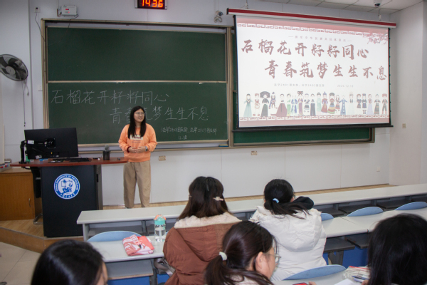 为深入学习贯彻习近平总书记关于加强和改进民族工作的重要思想,进一步增强青年学子对中华多元民族文化的认同与理解,筑牢中华民族共同体意识,2025年12月18日,法学2401、2403团支部于东环102教室联合举办了以“石榴花开籽籽同心,青春筑梦生生不息”为主题的团日活动。活动特别邀请学校石榴籽宣讲团成员维吾尔族穆合斯娜、哈萨克族热依娜、藏族益西曲宗三位同学,为支部成员带来生动而深刻的民族文化分享。